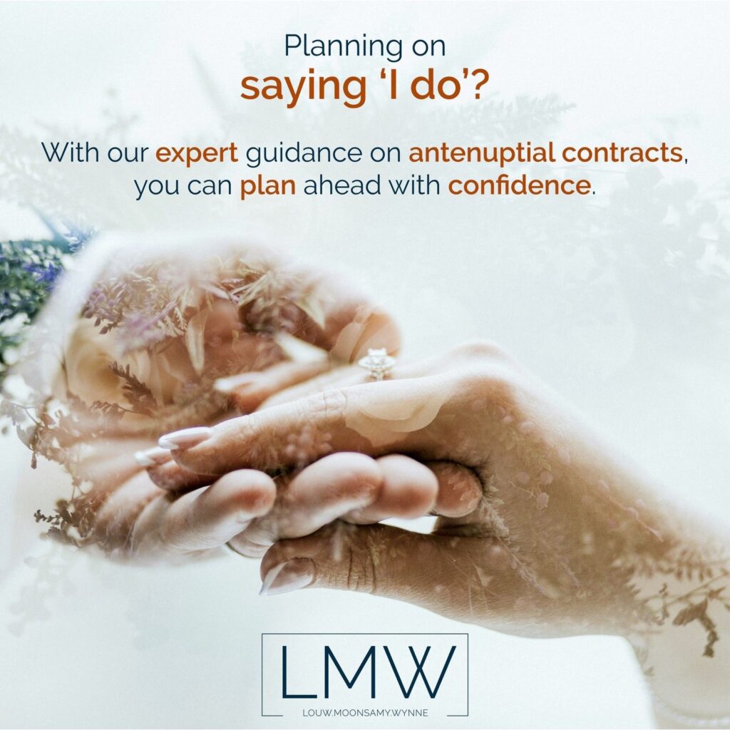If you are getting married and your intention is to be married out of community of property, you should be aware that entering into an Antenuptial Contract is not a quick process. Ensure that there is adequate time for the Antenuptial Contract to be signed by you and your partner, in front of two witnesses and attested by a Notary Public before the wedding date. Thereafter the Antenuptial Contact will be registered in the Deeds Office. There are multiple requirements to be met and it is advisable that you consult with LMW Attorneys before you conclude your marriage. During the consultation phase we will explain all the possible options to conclude the most appropriate agreement. Consultation can either be an in person consultation or via Zoom/Teams/WhatsApp Video Call or telephone call. However, the actual signing of the contract will have to be in person.